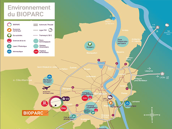 Idéalement situé entre le site principal du CHU et l’aéroport international, le Bioparc est directement accessible par la rocade autoroutière de Bordeaux et à proximité du plus grand centre commercial de la région bordelaise. Desserte et accès : - Proche des 3 sites du CHU de Bordeaux (Pellegrin : 15 min, Arnozan et Haut-Lévêque : 5 min) - En bordure de sortie n° 12 de la rocade bordelaise - Bus : terminus ligne n°30 / Tram à Pessac et Mérignac - Gare TGV : 20 min (Bordeaux/Paris 2h00 en 2017) - Aéroport : 10 mn (Londres, Barcelone, Munich, Montréal, Genève, Amsterdam…45 lignes directes régulières) - Accès très haut débit : réseau public INOLIA (fibre optique)