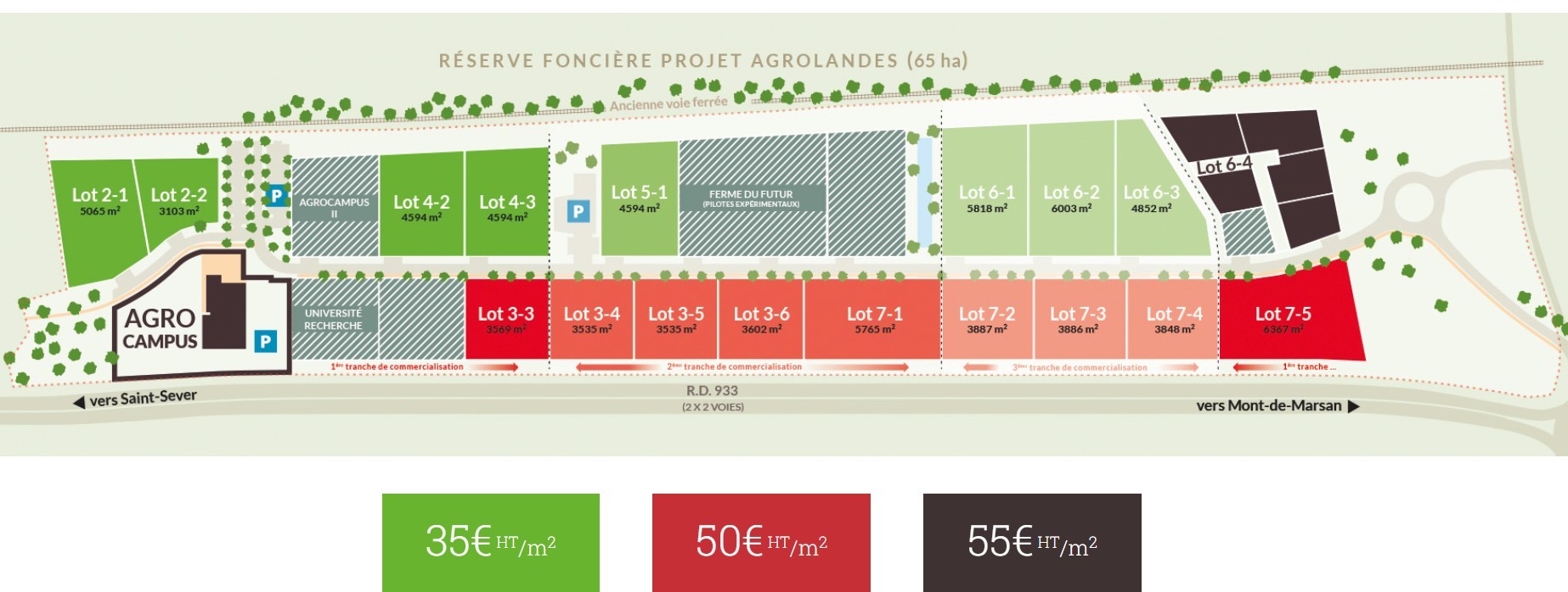 Une superficie de 12 hectares, accueille les entreprises souhaitant se développer sur le territoire avec 24 lots viabilisés. Trois prix de vente de 35 €, 50 € et 55 €/m² suivant le positionnement, la surface et la visibilité. Les lots vont de 3100 m² à 6400 m².