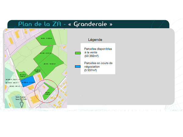 Plus qu'une parcelle disponible : N=° 640 : 4 655 m² (terrain viabilisé) Voirie de desserte interne adaptée pour le trafic poids - lourds avec trottoirs ; Plates-formes terrassées avec une faible pente garantissant l’écoulement des eaux de surface ; Réseau d’eau potable (Contrat d’affermage avec comme opérateur la SAUR) ; Desserte incendie assurée sur la zone d’activités (pression assurée de 60 m3/heure pendant 2 heures) ; Desserte en électricité et gaz naturel ; Couverture téléphonie fixe, téléphonie mobile ; Accès au haut débit (20 Mo) – Installation de la fibre optique prévue ; Eclairage public ; Aménagements paysagers.